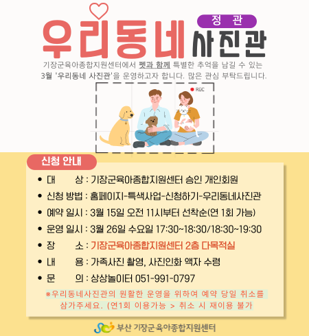 | ±âŸ»çÇ× | *3¿ù ¿ì¸®µ¿³× »çÁø°üÀº ±âÀ屺 À°¾ÆÁ¾ÇÕÁö¿ø¼¾ÅÍ(Á¤°ü)´Ù¸ñÀû½Ç¿¡¼ ÁøÇàÇÕ´Ï´Ù. *¿ì¸®µ¿³× »çÁø°üÀº °³ÀνÂÀÎȸ¿ø¸¸ °¡´ÉÇÕ´Ï´Ù *¿ì¸®µ¿³× »çÁø°üÀº ¿¬1ȸ ½Åû °¡´ÉÇÕ´Ï´Ù.(2¿ù~11¿ù±îÁö ¿î¿µ) *ÃÔ¿µ»çÁøÀÇ ÀúÀÛ±ÇÀº À°¾ÆÁ¾ÇÕÁö¿ø¼¾ÅÍ¿¡ ÀÖÀ¸¸ç, È«º¸¿ëÀ¸·Î »ç¿ëµÉ ¼ö ÀÖ½À´Ï´Ù. *¿ì¸®µ¿³×»çÁø°üÀÇ ¿øÈ°ÇÑ ¿î¿µÀ» À§ÇÏ¿© ¿¹¾à ´çÀÏ Ãë¼Ò¸¦ »ï°¡ ÁÖ¼¼¿ä. (¿¬1ȸ À̿밡´É ¡æ Ãë¼Ò½Ã ÀçÀÌ¿ë ºÒ°¡) |