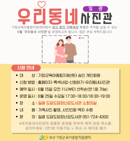 | ±âŸ»çÇ× | *6¿ù ¿ì¸®µ¿³× »çÁø°üÀº Àϱ¤ µµ´ãµµ´ãÀå³°¨µµ¼°ü¿¡¼ ÁøÇàÇÕ´Ï´Ù. *¿ì¸®µ¿³× »çÁø°üÀº °³ÀνÂÀÎȸ¿ø¸¸ °¡´ÉÇÕ´Ï´Ù. *¿ì¸®µ¿³× »çÁø°üÀº ¿¬1ȸ ½Åû °¡´ÉÇÕ´Ï´Ù.(2¿ù~11¿ù±îÁö ¿î¿µ) *ÃÔ¿µ»çÁøÀÇ ÀúÀÛ±ÇÀº À°¾ÆÁ¾ÇÕÁö¿ø¼¾ÅÍ¿¡ ÀÖÀ¸¸ç, È«º¸¿ëÀ¸·Î »ç¿ëµÉ ¼ö ÀÖ½À´Ï´Ù. *¿ì¸®µ¿³×»çÁø°üÀÇ ¿øÈ°ÇÑ ¿î¿µÀ» À§ÇÏ¿© ¿¹¾à ´çÀÏ Ãë¼Ò¸¦ »ï°¡ ÁÖ¼¼¿ä. (¿¬1ȸ À̿밡´É ¡æ Ãë¼Ò½Ã ÀçÀÌ¿ë ºÒ°¡) |