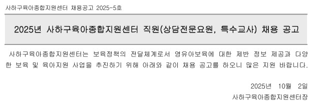 (»çÇϱ¸À°¾ÆÁ¾ÇÕÁö¿ø¼¾ÅÍ Ã¤¿ë°ø°í 2025-05È£) »çÇϱ¸À°¾ÆÁ¾ÇÕÁö¿ø¼¾ÅÍ Á÷¿ø(»ó´ãÀü¹®¿ä¿ø, Ư¼ö±³»ç) ä¿ë °ø°í¹®.pdf
