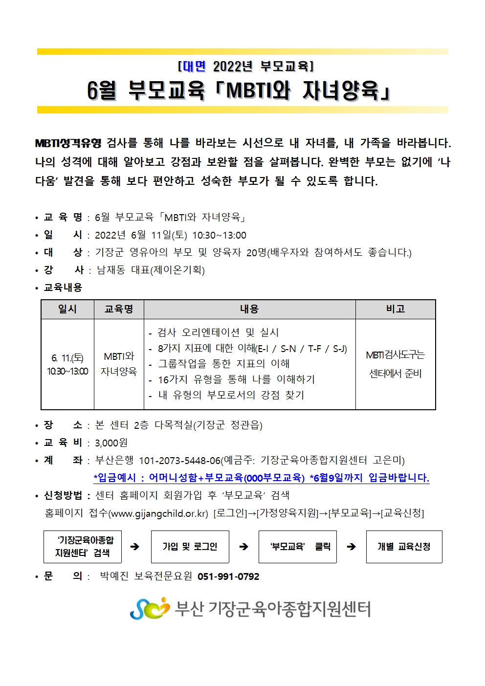 | ¹®ÀÇ | ¹Ú¿¹Áø º¸À°Àü¹®¿ä¿ø 051-991-0792 | ||