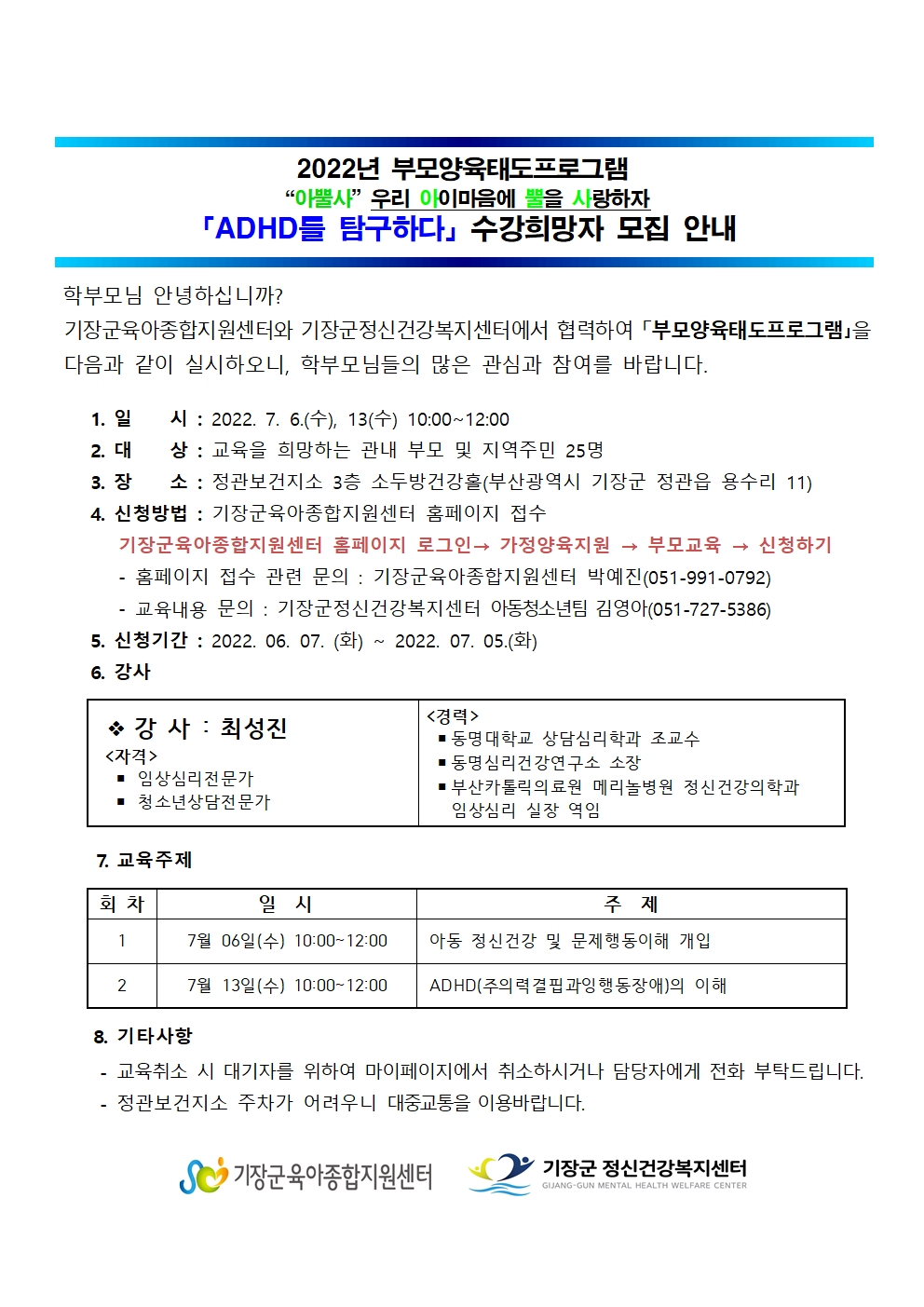 ±âÀ屺Á¤½Å°Ç°­º¹Áö¼¾ÅÍ Çù·Â±³À° - 2022³â ºÎ¸ð¾çÀ°ÅµµÇÁ·Î±×·¥ 'ADHD¸¦ ޱ¸ÇÏ´Ù'