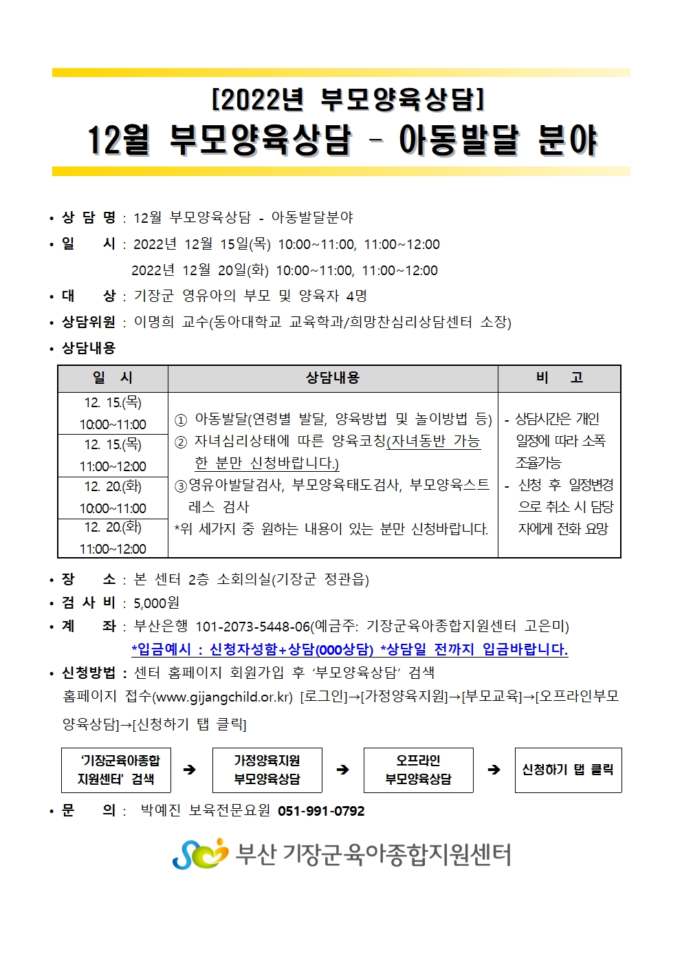 | ¹®ÀÇ | ¹Ú¿¹Áø º¸À°Àü¹®¿ä¿ø 051-991-0792 | ||