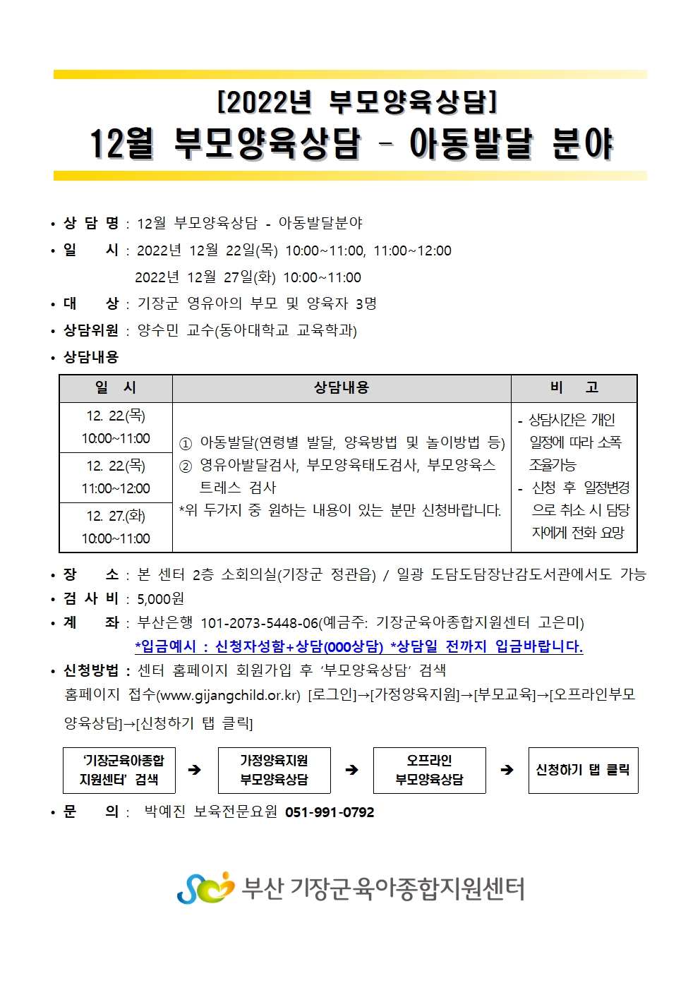 | ¹®ÀÇ | ¹Ú¿¹Áø º¸À°Àü¹®¿ä¿ø 051-991-0792 | ||