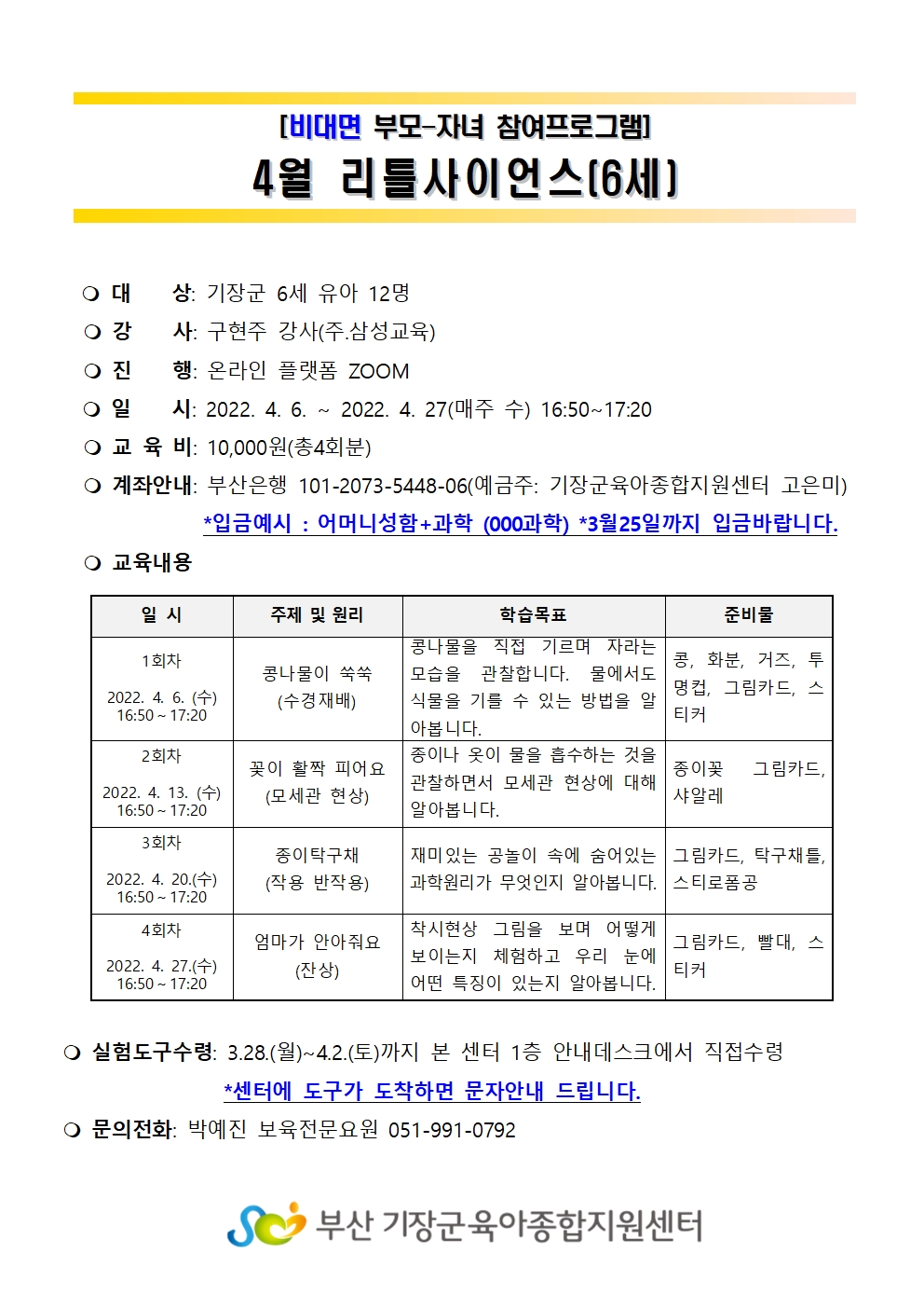 | ¹®ÀÇ | ¹Ú¿¹Áø º¸À°Àü¹®¿ä¿ø 051-991-0792 | ||