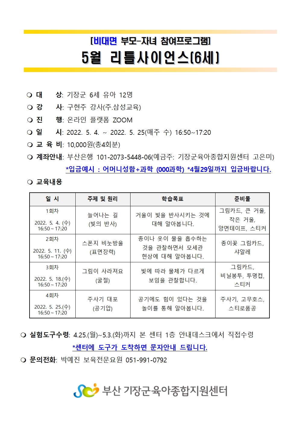 | ¹®ÀÇ | ¹Ú¿¹Áø º¸À°Àü¹®¿ä¿ø 051-991-0792 | ||