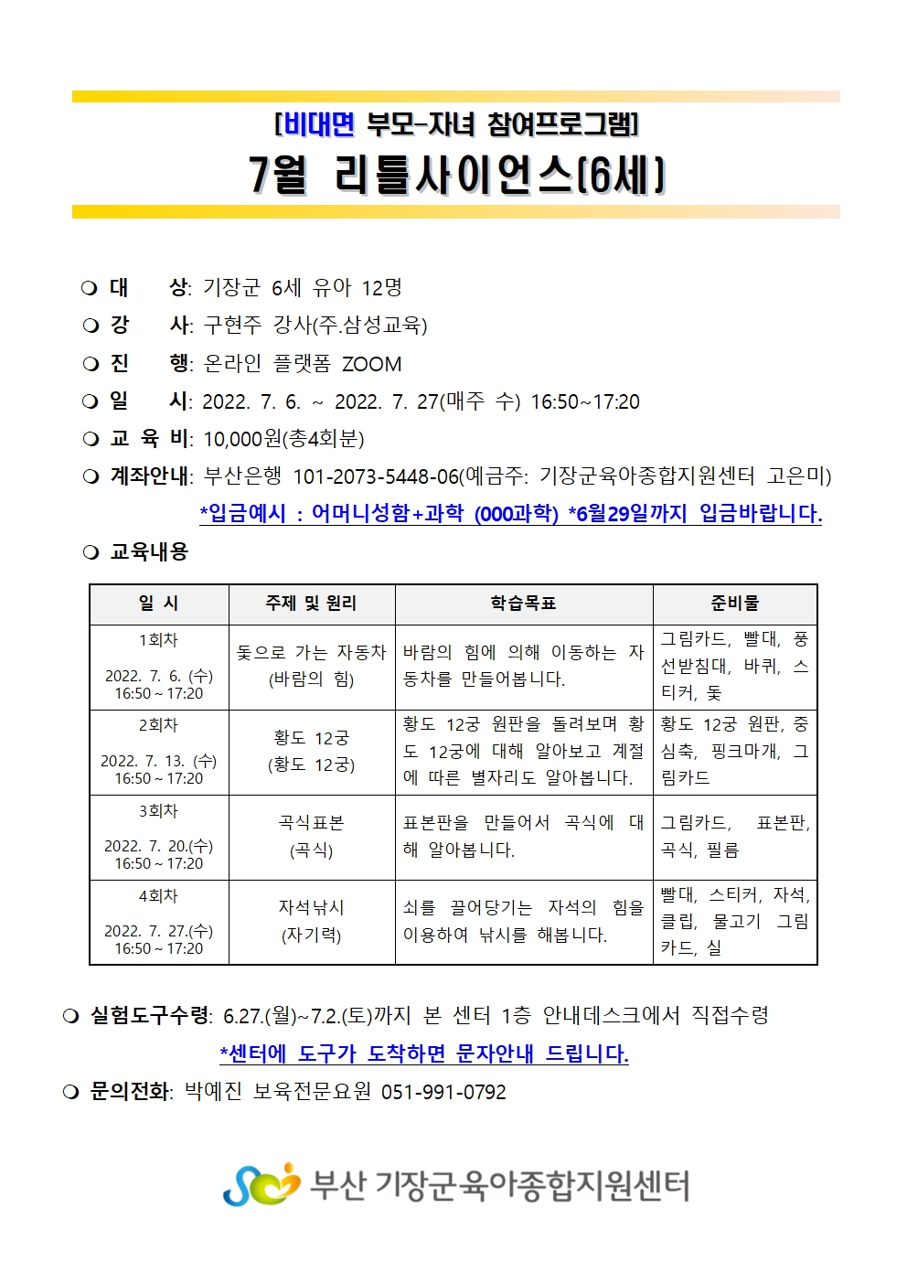 | ¹®ÀÇ | ¹Ú¿¹Áø º¸À°Àü¹®¿ä¿ø 051-991-0792 | ||