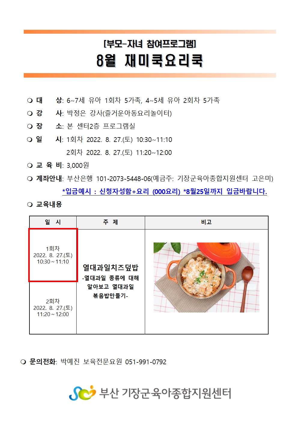 | ¹®ÀÇ | ¹Ú¿¹Áø º¸À°Àü¹®¿ä¿ø 051-991-0792 | ||
