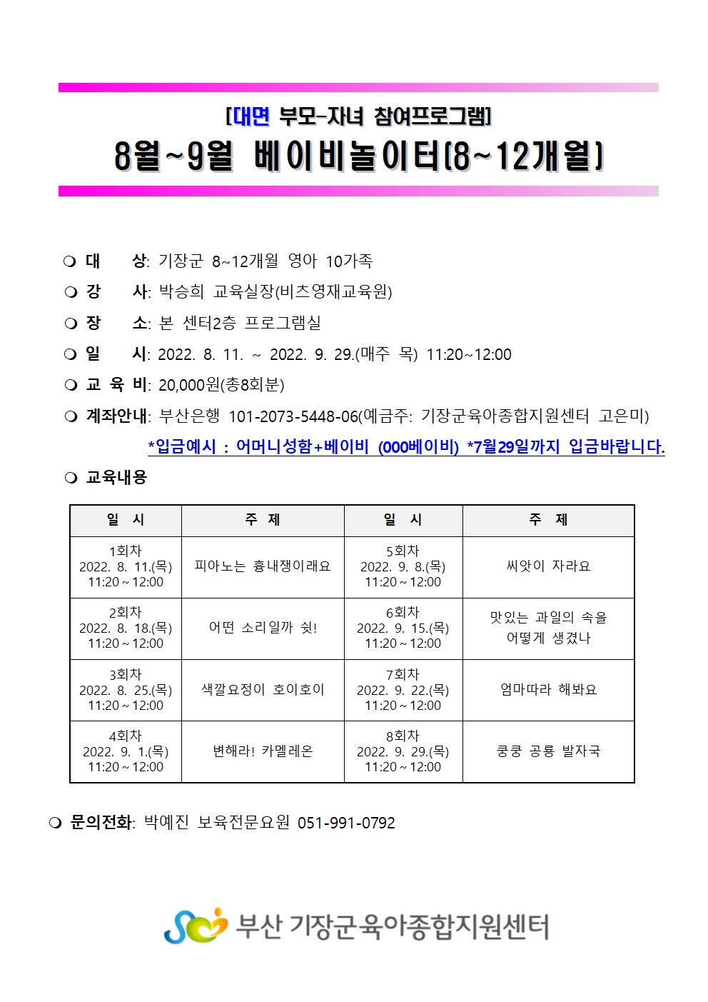 | ¹®ÀÇ | ¹Ú¿¹Áø º¸À°Àü¹®¿ä¿ø 051-991-0792 | ||