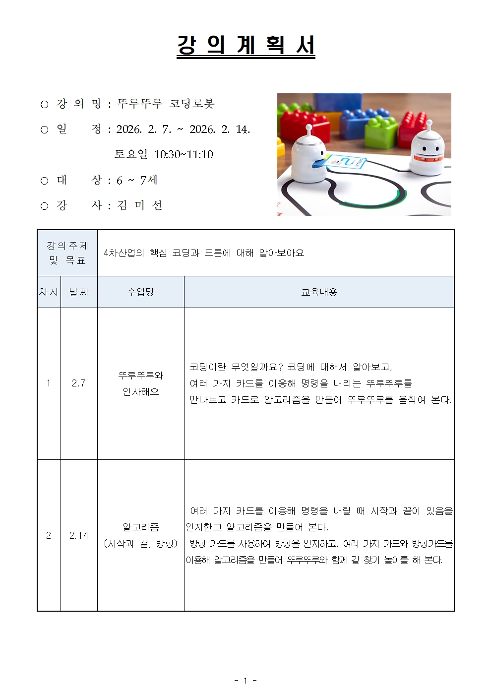 | 2026³â 2¿ù ÁÖ¸»ÇÁ·Î±×·¥ ¶Ñ·ç¶Ñ·ç ·Îº¿ÄÚµù 6~7¼¼ | |||