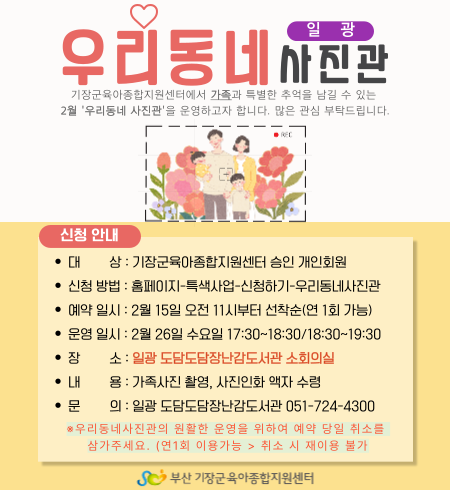 | ±âŸ»çÇ× | *2¿ù ¿ì¸®µ¿³× »çÁø°üÀº Àϱ¤ µµ´ãµµ´ãÀå³°¨µµ¼°ü¿¡¼ ÁøÇàÇÕ´Ï´Ù. *¿ì¸®µ¿³× »çÁø°üÀº °³ÀνÂÀÎȸ¿ø¸¸ °¡´ÉÇÕ´Ï´Ù. *¿ì¸®µ¿³× »çÁø°üÀº ¿¬1ȸ ½Åû °¡´ÉÇÕ´Ï´Ù.(2¿ù~11¿ù±îÁö ¿î¿µ) *ÃÔ¿µ»çÁøÀÇ ÀúÀÛ±ÇÀº À°¾ÆÁ¾ÇÕÁö¿ø¼¾ÅÍ¿¡ ÀÖÀ¸¸ç, È«º¸¿ëÀ¸·Î »ç¿ëµÉ ¼ö ÀÖ½À´Ï´Ù. *¿ì¸®µ¿³×»çÁø°üÀÇ ¿øÈ°ÇÑ ¿î¿µÀ» À§ÇÏ¿© ¿¹¾à ´çÀÏ Ãë¼Ò¸¦ »ï°¡ ÁÖ¼¼¿ä. (¿¬1ȸ À̿밡´É ¡æ Ãë¼Ò½Ã ÀçÀÌ¿ë ºÒ°¡) |