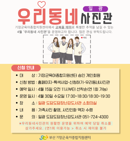 | ±âŸ»çÇ× | *4¿ù ¿ì¸®µ¿³× »çÁø°üÀº Àϱ¤ µµ´ãµµ´ãÀå³°¨µµ¼°ü¿¡¼ ÁøÇàÇÕ´Ï´Ù. *¿ì¸®µ¿³× »çÁø°üÀº °³ÀνÂÀÎȸ¿ø¸¸ °¡´ÉÇÕ´Ï´Ù. *¿ì¸®µ¿³× »çÁø°üÀº ¿¬1ȸ ½Åû °¡´ÉÇÕ´Ï´Ù.(2¿ù~11¿ù±îÁö ¿î¿µ) *ÃÔ¿µ»çÁøÀÇ ÀúÀÛ±ÇÀº À°¾ÆÁ¾ÇÕÁö¿ø¼¾ÅÍ¿¡ ÀÖÀ¸¸ç, È«º¸¿ëÀ¸·Î »ç¿ëµÉ ¼ö ÀÖ½À´Ï´Ù. *¿ì¸®µ¿³×»çÁø°üÀÇ ¿øÈ°ÇÑ ¿î¿µÀ» À§ÇÏ¿© ¿¹¾à ´çÀÏ Ãë¼Ò¸¦ »ï°¡ ÁÖ¼¼¿ä. (¿¬1ȸ À̿밡´É ¡æ Ãë¼Ò½Ã ÀçÀÌ¿ë ºÒ°¡) |