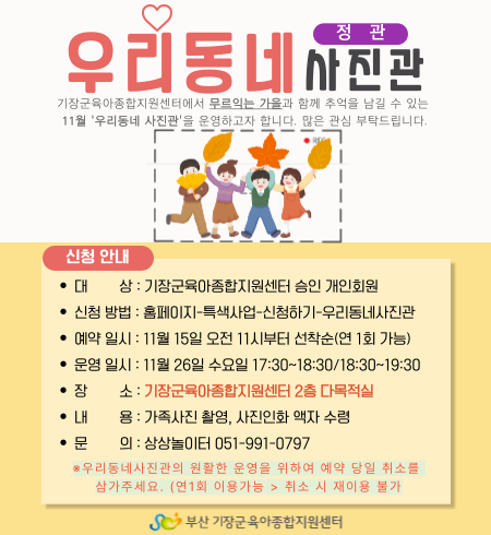 | ±âŸ»çÇ× | *11¿ù ¿ì¸®µ¿³× »çÁø°üÀº ±âÀ屺 À°¾ÆÁ¾ÇÕÁö¿ø¼¾ÅÍ(Á¤°ü)´Ù¸ñÀû½Ç¿¡¼ ÁøÇàÇÕ´Ï´Ù. *¿ì¸®µ¿³× »çÁø°üÀº °³ÀνÂÀÎȸ¿ø¸¸ °¡´ÉÇÕ´Ï´Ù *¿ì¸®µ¿³× »çÁø°üÀº ¿¬1ȸ ½Åû °¡´ÉÇÕ´Ï´Ù.(2¿ù~11¿ù±îÁö ¿î¿µ) *ÃÔ¿µ»çÁøÀÇ ÀúÀÛ±ÇÀº À°¾ÆÁ¾ÇÕÁö¿ø¼¾ÅÍ¿¡ ÀÖÀ¸¸ç, È«º¸¿ëÀ¸·Î »ç¿ëµÉ ¼ö ÀÖ½À´Ï´Ù. *¿ì¸®µ¿³×»çÁø°üÀÇ ¿øÈ°ÇÑ ¿î¿µÀ» À§ÇÏ¿© ¿¹¾à ´çÀÏ Ãë¼Ò¸¦ »ï°¡ ÁÖ¼¼¿ä. (¿¬1ȸ À̿밡´É ¡æ Ãë¼Ò½Ã ÀçÀÌ¿ë ºÒ°¡) |