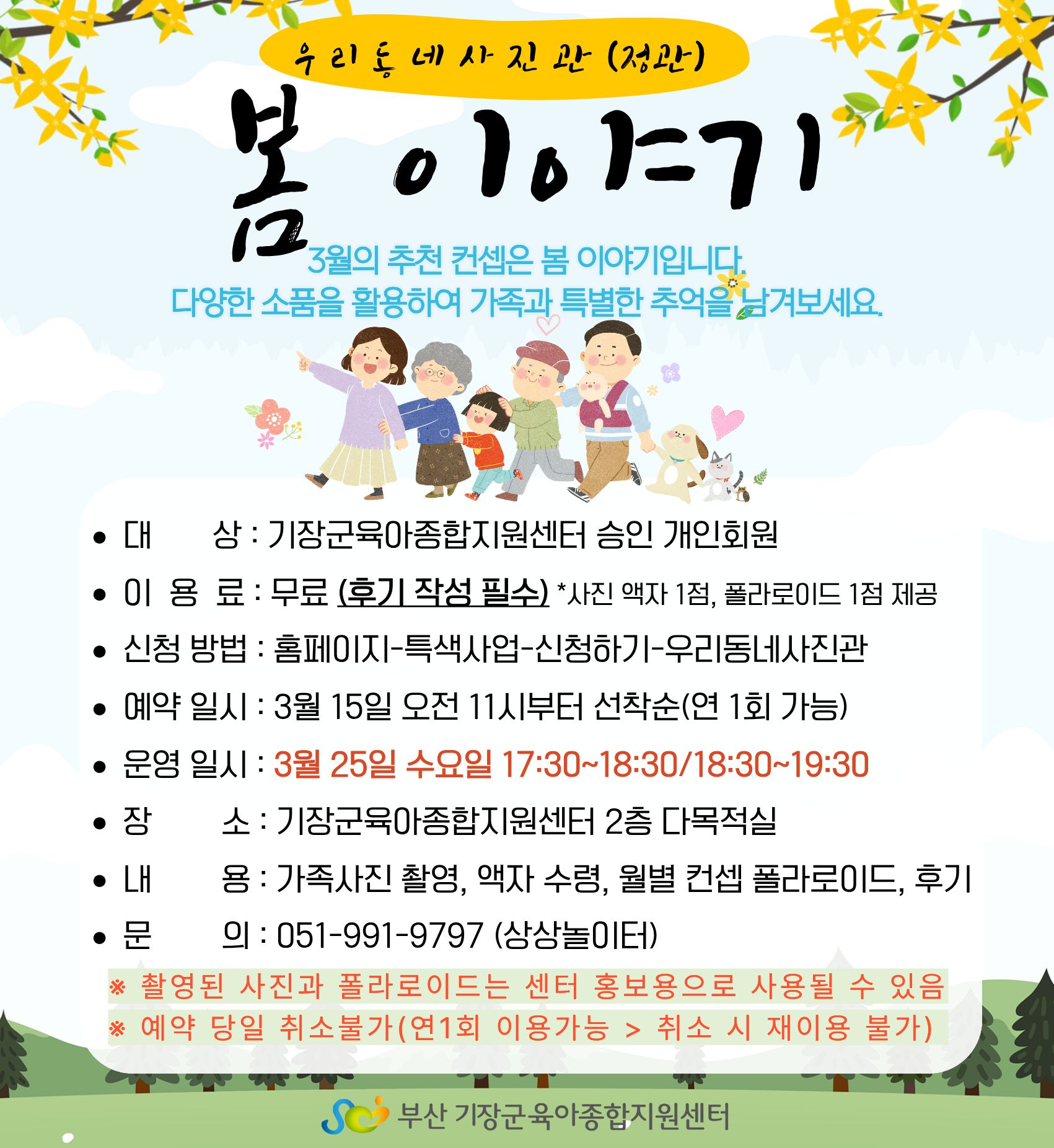 | ±âŸ»çÇ× | *3¿ù ¿ì¸®µ¿³×»çÁø°üÀº º» ¼¾ÅÍ 2Ãþ ´Ù¸ñÀû½Ç(±âÀ屺 Á¤°üÀ¾) ÁøÇàÇÕ´Ï´Ù. *¿ì¸®µ¿³×»çÁø°üÀº °³ÀνÂÀÎȸ¿ø¸¸ °¡´ÉÇÕ´Ï´Ù. *¿ì¸®µ¿³×»çÁø°üÀº ¿¬1ȸ ½Åû °¡´ÉÇÕ´Ï´Ù.(2¿ù~11¿ù±îÁö ¿î¿µ/ 4¿ù, 7¿ù ¿î¿µ X) *ÃÔ¿µ»çÁøÀÇ ÀúÀÛ±ÇÀº À°¾ÆÁ¾ÇÕÁö¿ø¼¾ÅÍ¿¡ ÀÖÀ¸¸ç, È«º¸¿ëÀ¸·Î »ç¿ëµÉ ¼ö ÀÖ½À´Ï´Ù. *Ãßõ ÄÁ¼Á¿¡ µû¶ó Æú¶ó·ÎÀ̵å´Â 2Àå ÃÔ¿µÇϸç 1ÀåÀº Á¦°ø, 1ÀåÀº ¼¾ÅÍ È«º¸¿ëÀ¸·Î »ç¿ëµË´Ï´Ù. *¿ì¸®µ¿³×»çÁø°üÀÇ ¿øÈ°ÇÑ ¿î¿µÀ» À§ÇÏ¿© ¿¹¾à ´çÀÏ Ãë¼Ò¸¦ »ï°¡ ÁÖ¼¼¿ä. (¿¬1ȸ À̿밡´É ¡æ Ãë¼Ò½Ã ÀçÀÌ¿ë ºÒ°¡) |