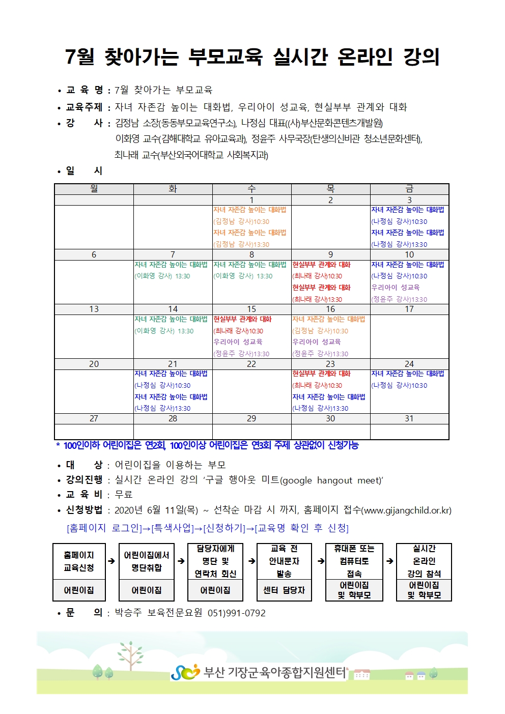 | 7¿ù ã¾Æ°¡´Â ºÎ¸ð±³À° ½Ç½Ã°£ ¿Â¶óÀÎ °ÀÇ-Çö½ÇºÎºÎ °ü°è¿Í ´ëÈ-3°³¼Ò °øµ¿ÁøÇà | |||